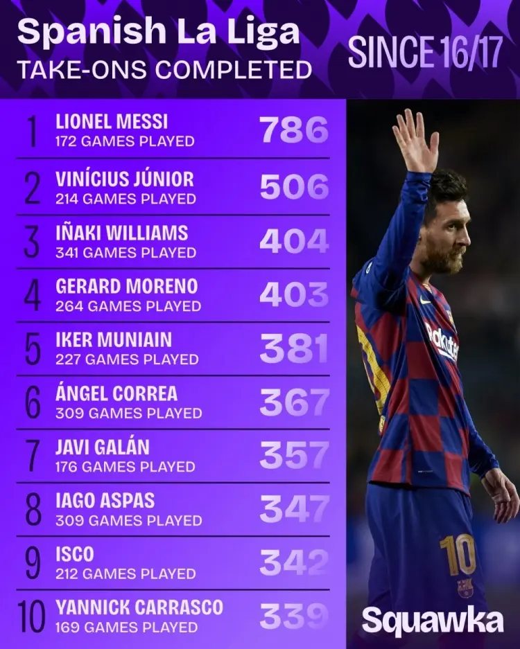 同期第二是维尼修斯,比梅西少了快300次,一共是506次。维尼修斯时不时被报道可能去沙特或者离开皇马,可能等他离开西甲,都不一定能超过梅西。但维尼修斯已经算猛的了,他比第三多了100次。第三是伊纳基·威廉姆斯,404次。